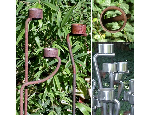 Für den Garten oder den Balkon. Fassung für Teelicht vorgesehen. Die Eisenstäbe steckt man einfach in die Erde. Mit den Jahreszeiten rosten die Lichtnägel und erhalten so eine reizvolle Oberfläche. Wer das nicht möchte, kann das Eisen mit Öl einreiben. Bitte beachten Sie, dass die Lichtnägel handgebogene Einzelstücke sind. Ihren Formwunsch können Sie unter Größe angeben. Am schönsten wirkt eine Gruppe von dreien. Sollten Sie mehrere auswählen, stellen wir natürlich eine harmonische Kombination zusammen.